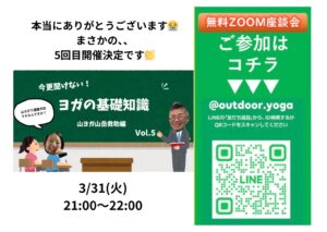 - [2/21,22,26 無料 ZOOM 座談会] 今更聞けない ヨガの基礎知識!(琵琶湖支部イベント)今更聞けない ヨガの基礎知識! @yui.outdoor.yog… 続きを読む: [2/21,22,26 無料 ZOOM 座談会] 今更聞けない ヨガの基礎知識!(琵琶湖支部イベント)