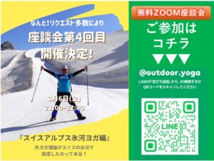 - [3/6 無料 ZOOM 座談会] 今更聞けない ヨガの基礎知識!【第4回 スイスアルプス氷河ヨガ編】(琵琶湖支部イベント)今更聞けない ヨガの基礎知識! @yui.outdoor.yog… 続きを読む: [3/6 無料 ZOOM 座談会] 今更聞けない ヨガの基礎知識!【第4回 スイスアルプス氷河ヨガ編】(琵琶湖支部イベント)