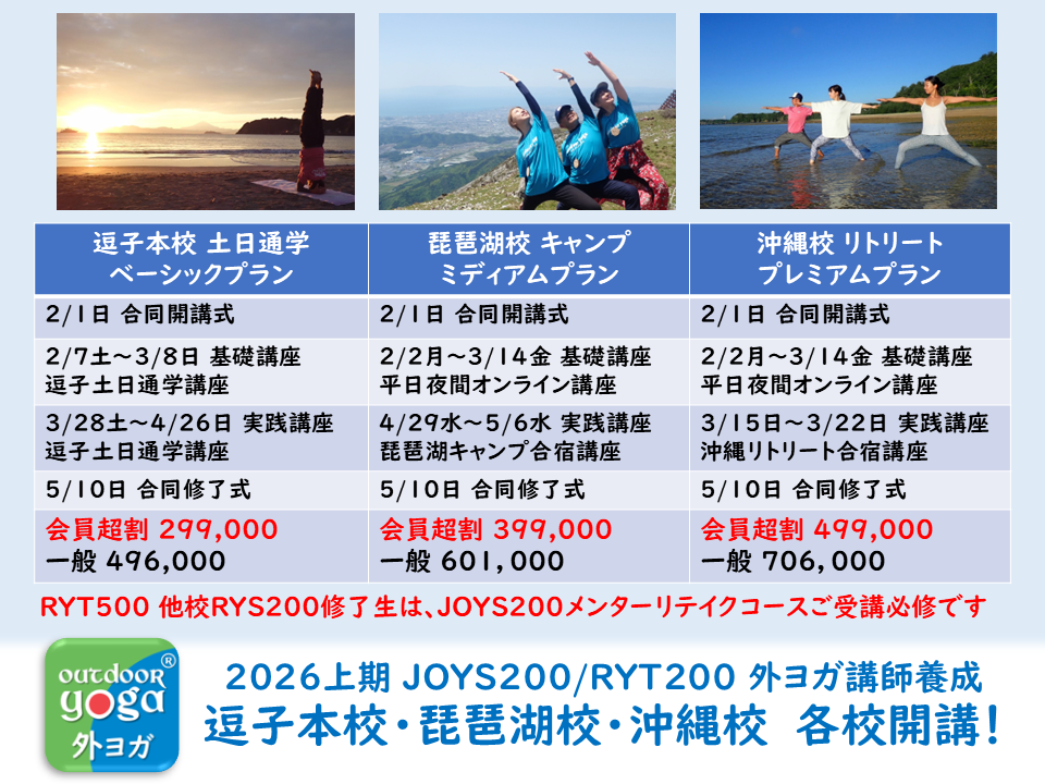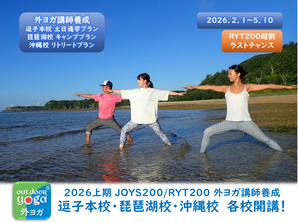 JOYS200/RYT200 外ヨガ講師養成 逗子本校・琵琶湖校・沖縄校 開催! 超割ラストチャンスです!