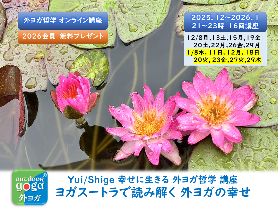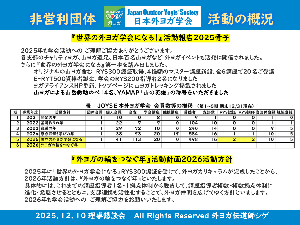 具体的には、これまでの講座指導者1名・1拠点体制から脱皮して、講座指導者複数・複数拠点体制に進化・発展させるとともに、支部連携も活性化することで、外ヨガ仲間を広げてゆく方針といまします。2026年も学会活動への ご理解ご協力をお願いいたします。